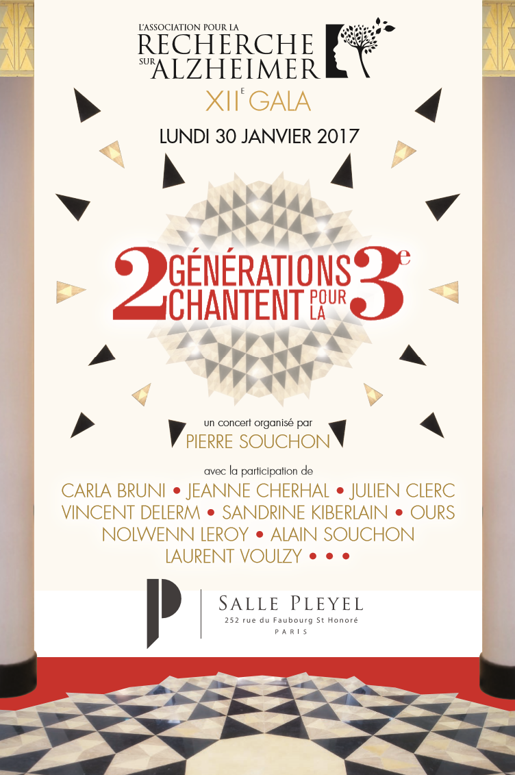 Le XIIe Gala de l’Association pour la Recherche sur Alzheimer aura lieu le Lundi 30 Janvier 2017 à la Salle Pleyel. Un concert exceptionnel crée par Pierre Souchon et ouvert au grand public