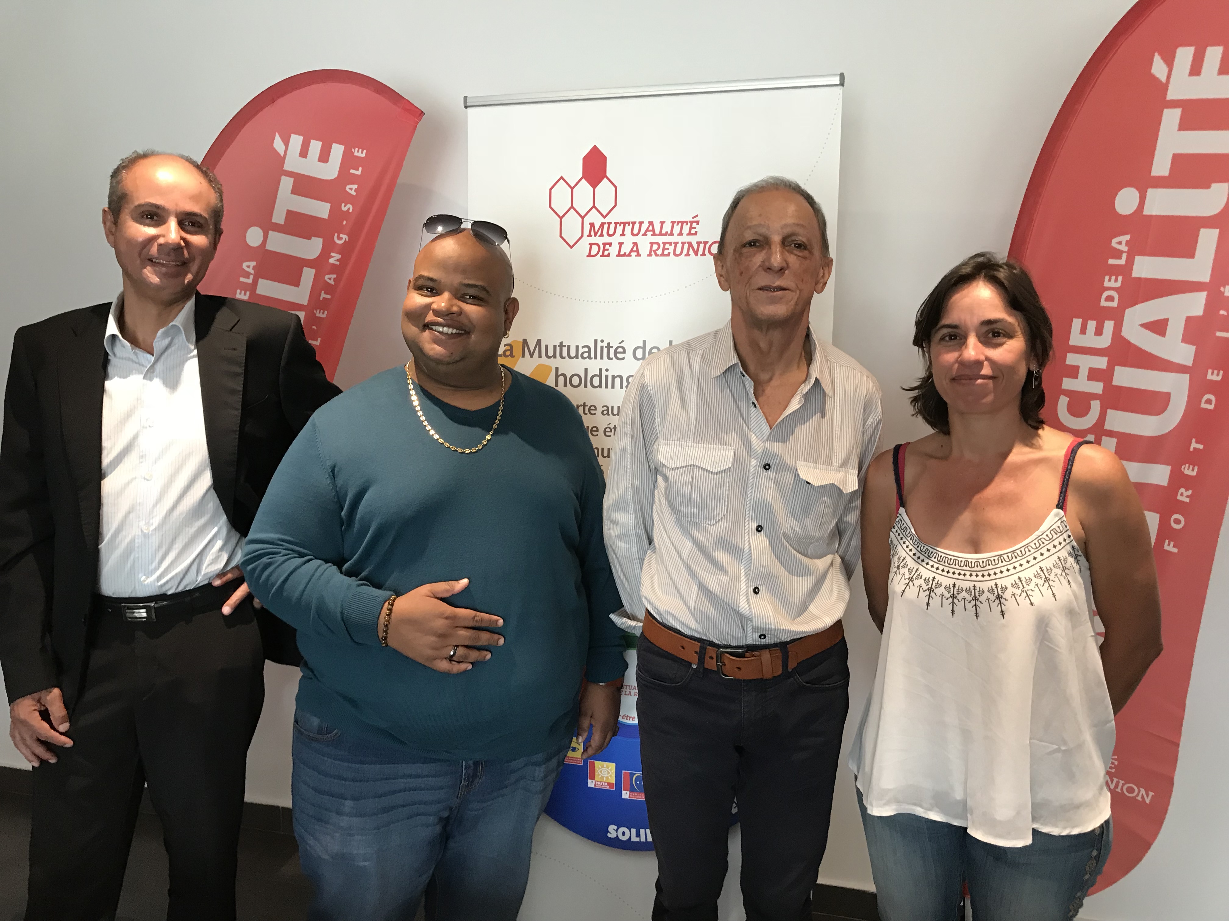de gauche à droite : Bobby et Maroni parrains de l'évènement, Théodore Hoarau, Président de La Mutualité de La Réunion et Diane Baillieux, Directrice de la Promotion de la santé)