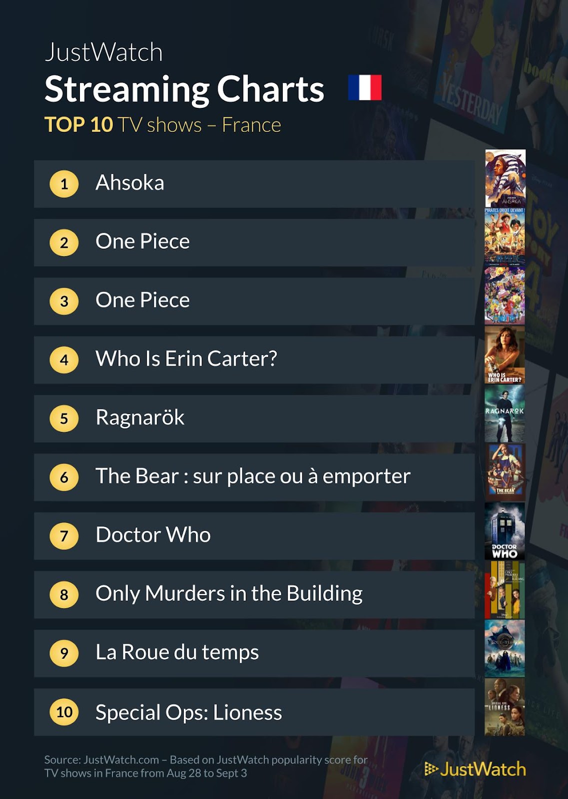 Au niveau des séries, on retrouve ainsi à la première place la série évènement "Ahsoka", disponible sur Disney+ suivi de la série live-action "One Piece" accessible sur Netflix et enfin à la troisième place on retrouve encore One Piece, mais la série animée, disponible sur Paramount+.