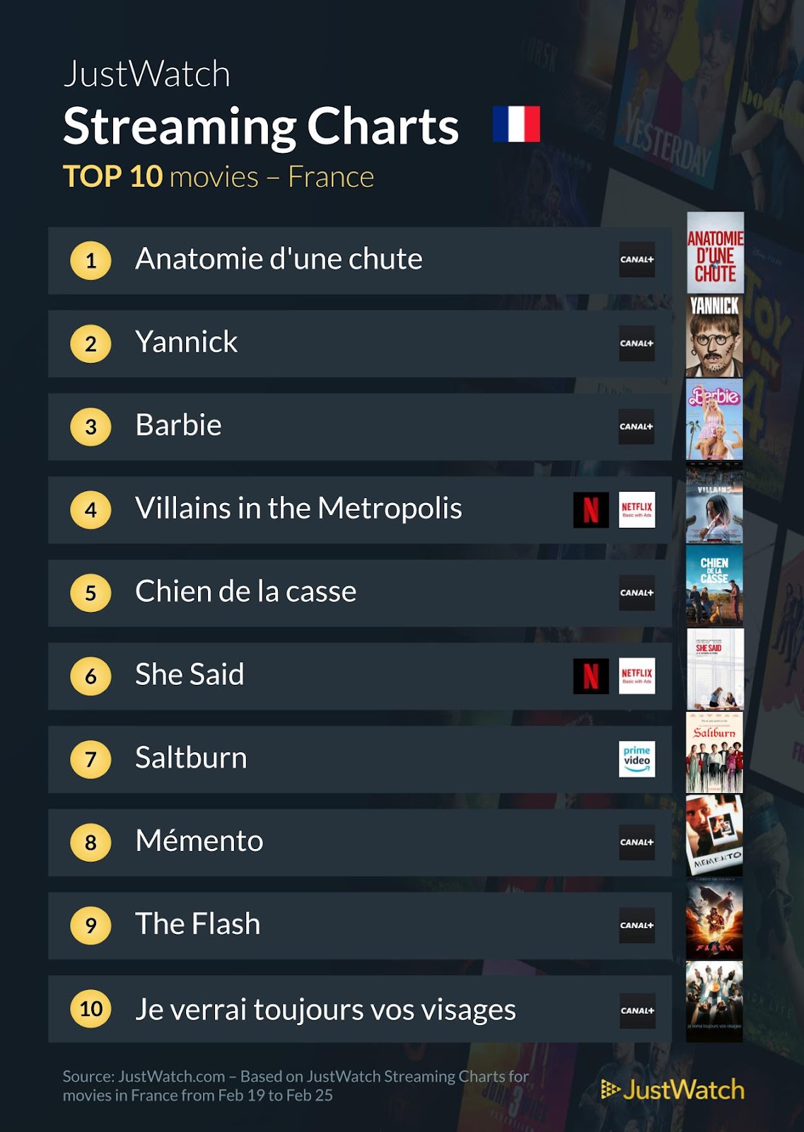 On retrouve à la première place, le film phénomène "Anatomie d'une chute" de Justine Triet, disponible sur Canal+, suivi du film "Yannick" avec Raphaël Quenard, Pio Marmaï ou encore Blanche Gardin, accessible aussi sur Canal+