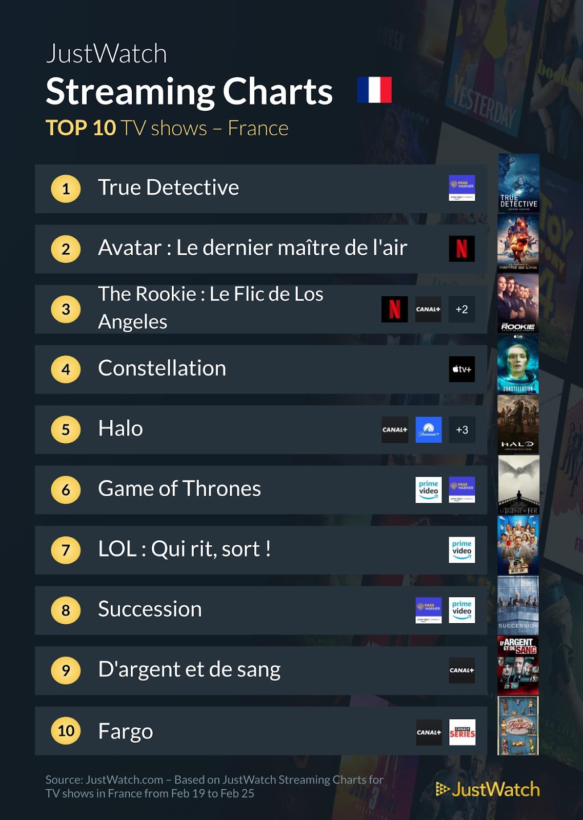 Du côté des séries, on retrouve à la première place, "True Detective" dont la dernière saison est accessible dans le Pass Warner via Prime Video suivi de "Avatar : le dernier maître de l'air", disponible sur Netflix.