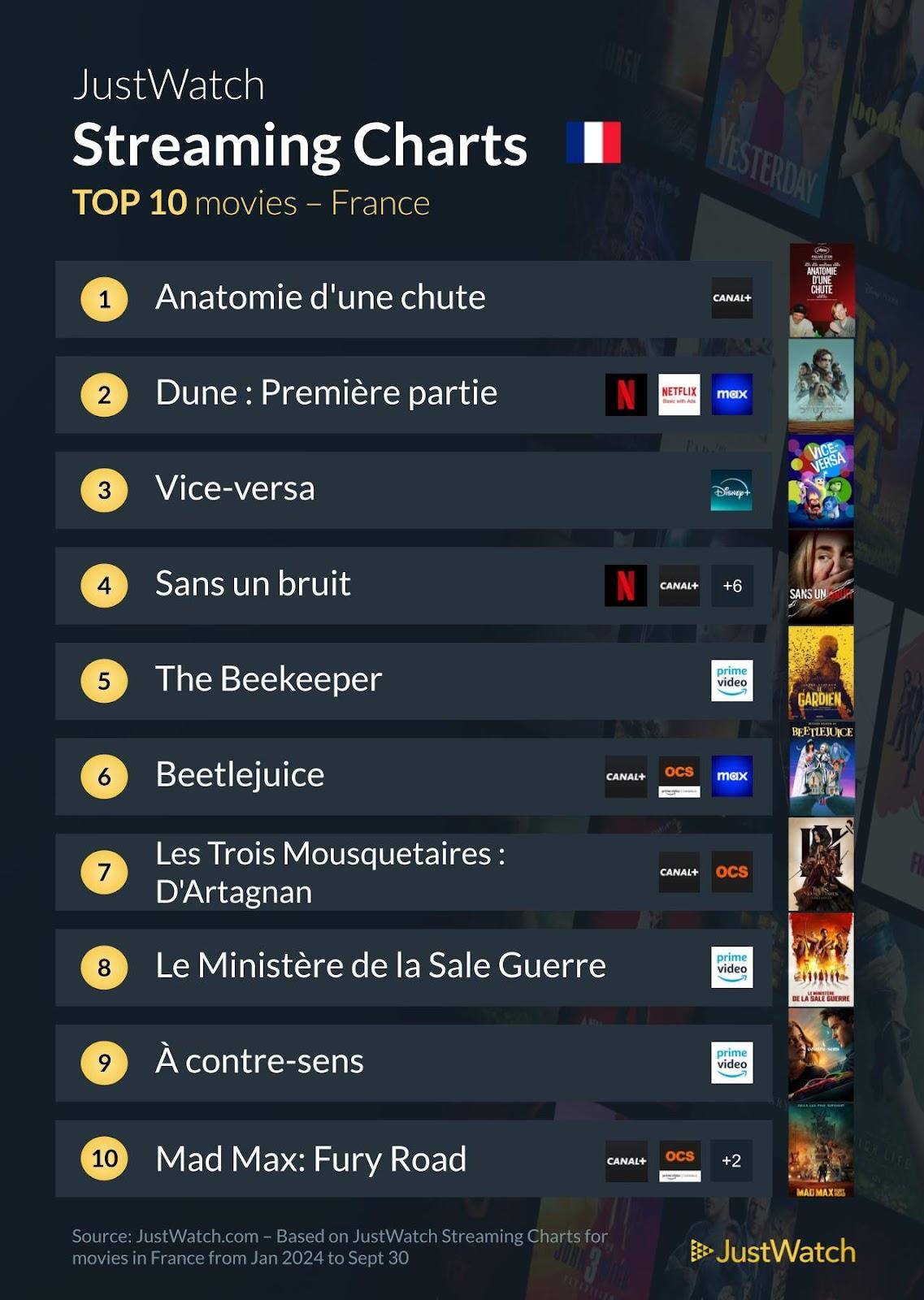 Le site partenaire JustWatch a répertorié les contenus les plus populaires en France sur les différentes plateformes de streaming (Netflix, myCANAL, Prime Video...) les neuf premiers mois de 2024 en France (Janvier à Septembre 2024).
