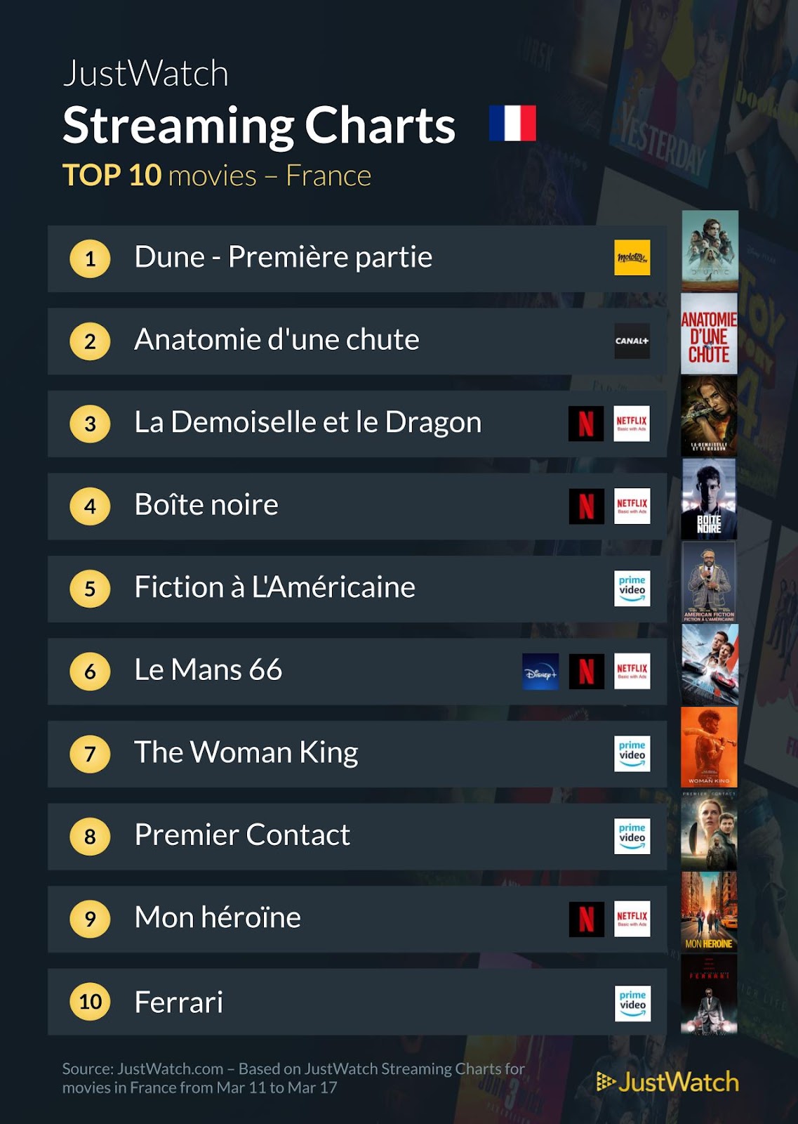 Suit ensuite "Anatomie d'une chute" de Justin Triet, accessible également sur Canal+ et enfin sur la dernière marche du podium on retrouve "La Demoiselle et le Dragon" avec Millie Bobbie Brown et trouvable sur Netflix.