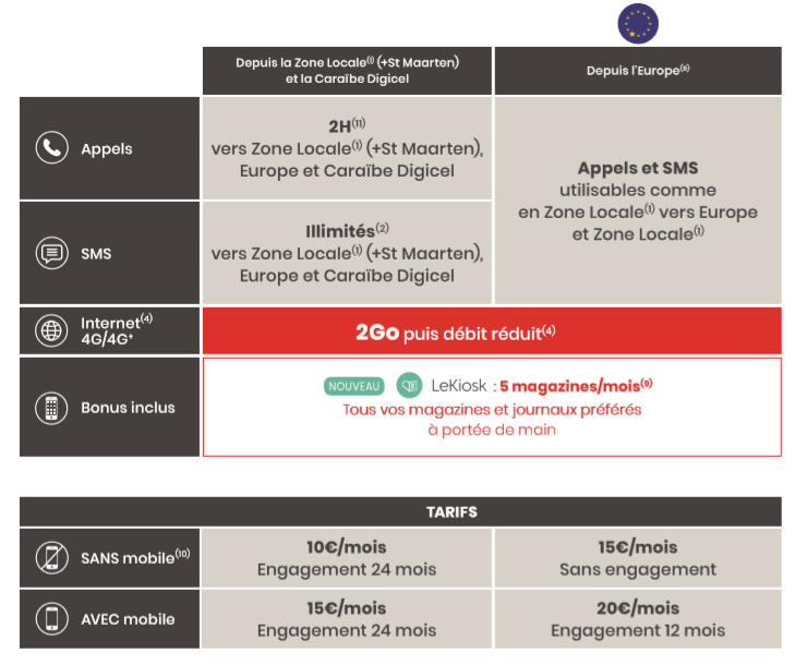 Appels et SMS illimités: Depuis la Zone Locale, la Caraïbe Digicel et St-Maarten vers la Zone Local¹, la Caraïbe Digicel, St-Maarten, l’Europe, les USA, Porto-Rico, le Canada et le Suriname (vers les mobiles Digicel uniquement) + 5h d’appels vers le Brésil et la République Dominicaine (0,25€/SMS). Depuis l’Europe vers la Zone Locale et l’Europe et depuis le Suriname vers la Zone Locale, la Caraïbe Digicel, St-Maarten, l’Europe, et le Suriname.
