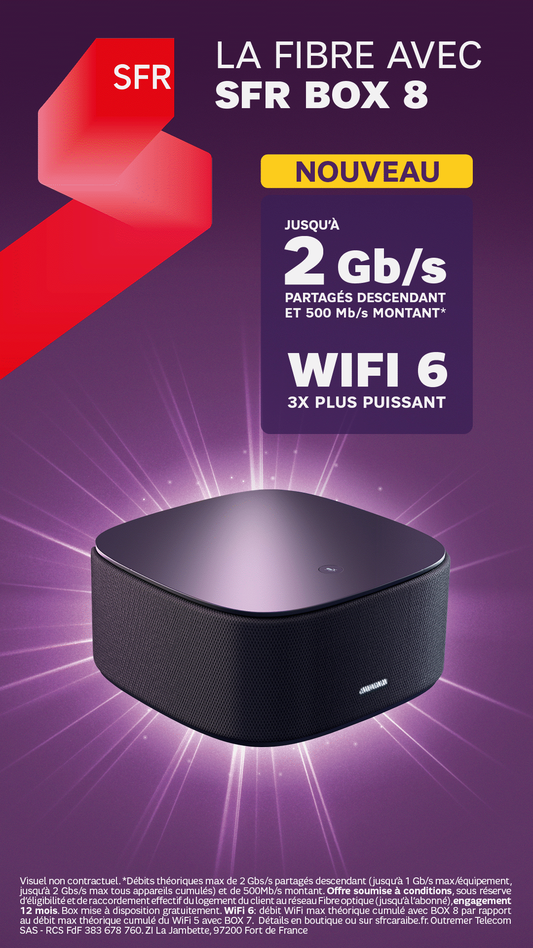 SFR Caraïbe propose la BOX 8 pour offir le meilleur de la technologie à ses clients dont : une expérience Télévision ultra innovante, l’image et le son du cinéma, plus de contenus et de services, une Box WiFi 6, 3 fois plus puissant, jusqu’à 2 Gbit/s partagés en débit descendant et 500 Mbit/s en débit montant, une Box ultra connectée répondant aux nouveaux usages du foyer.
