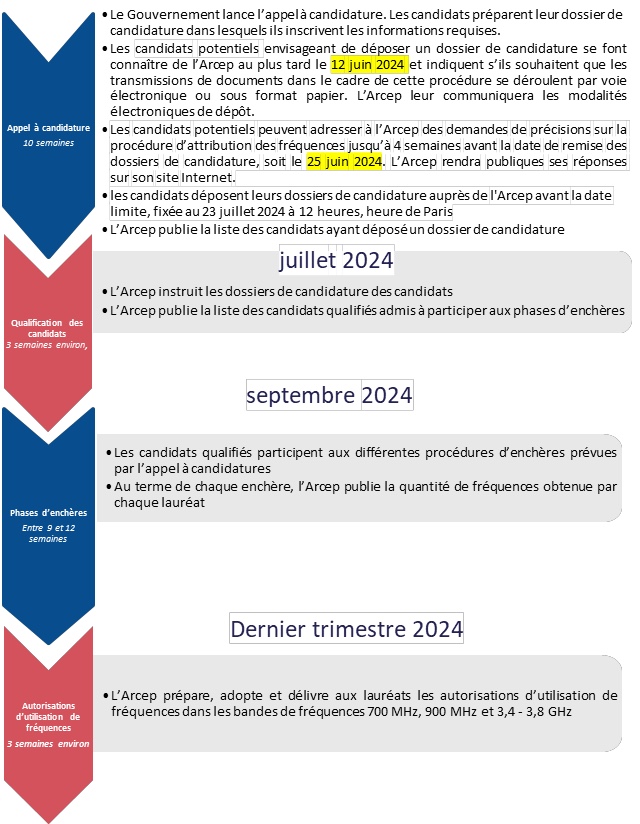 Les procédures pour l’attribution des fréquences dans les bandes 700 MHz, 900 MHz et 3,4 - 3,8 GHz en Martinique et en Guadeloupe ont été lancées le 8 mai 2024. Comme précédemment communiqué, quatre sociétés ont déposé des dossiers de candidature pour les procédures d’attribution de fréquences sur les territoires de la Martinique et de la Guadeloupe.