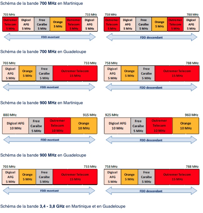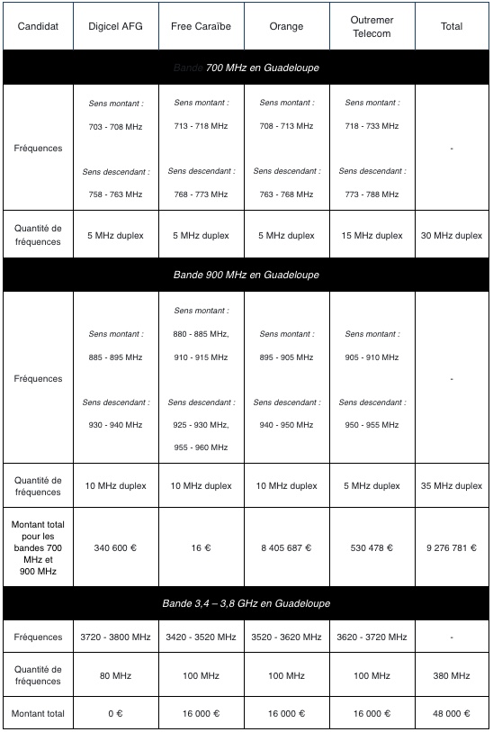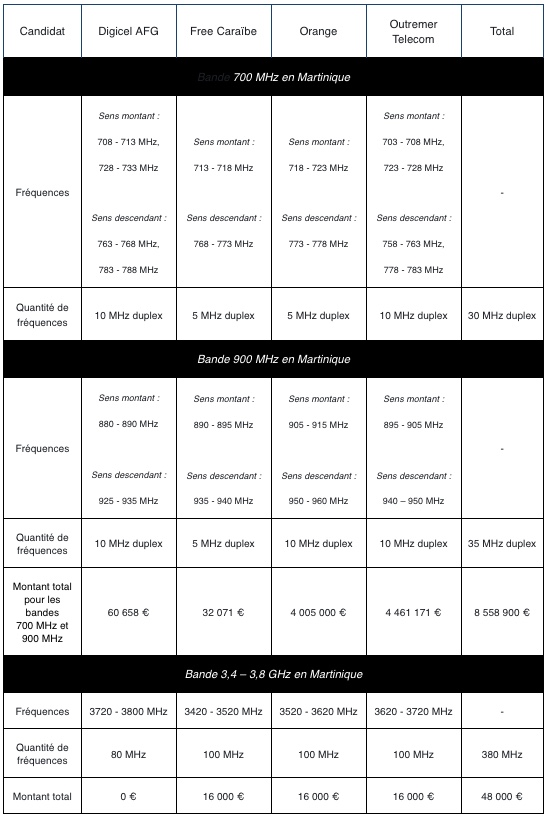 Les tableaux ci-dessous récapitulent les fréquences dans les bandes 700 MHz, 900 MHz et 3,4 - 3,8 GHz en Martinique et en Guadeloupe obtenues par chaque lauréat dans le cadre des procédures menées, ainsi que les montants que les lauréats devront verser au titre des présentes procédures d’attribution des fréquences :