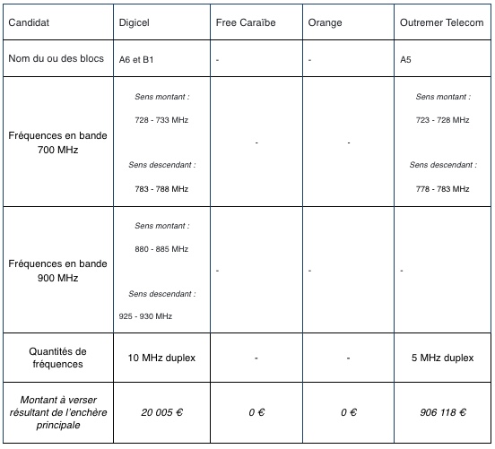 A l’issue de l’enchère principale sur les blocs de 5 MHz en bandes 700 MHz et 900 MHz en Martinique et en Guadeloupe, les résultats en Martinique sont les suivants :