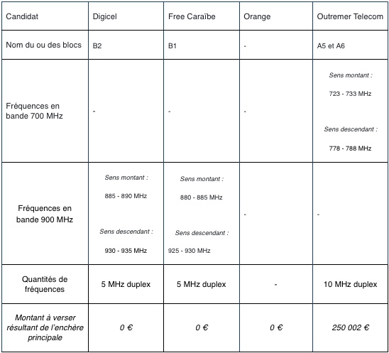À la suite de l’instruction des dossiers de candidatures, les enchères principales pour l’attribution des paquets de fréquences en bandes 700 MHz et 900 MHz en Martinique et en Guadeloupe ont permis de déterminer les quantités de fréquences obtenues par chacun des lauréats dans les sous-bandes 703 - 723 MHz et 758 - 778 MHz en Martinique et en Guadeloupe, dans les sous-bandes 885 - 915 MHz et 930 - 960 MHz en Martinique et dans les sous-bandes 890 - 915 MHz et 935 - 960 MHz en Guadeloupe, sous réserve que les présentes procédures d’attribution soient menées à leur terme. Les enchères de positionnement pour l’attribution des fréquences en bandes 700 MHz et 900 MHz contenues dans les paquets de fréquences ont ensuite permis de déterminer le positionnement de chacun des lauréats dans ces sous-bandes.