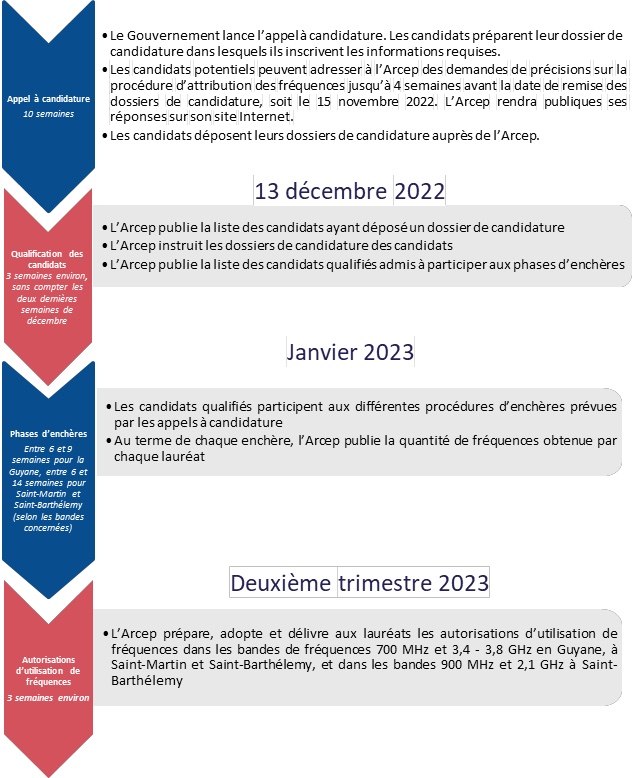 L'Arcep prévoit, comme le précise le calendrier indicatif ci-dessous, que les procédures aboutissent d'ici le deuxième trimestre 2023 ; elle pourra alors délivrer les autorisations d'utilisation de fréquences aux lauréats.