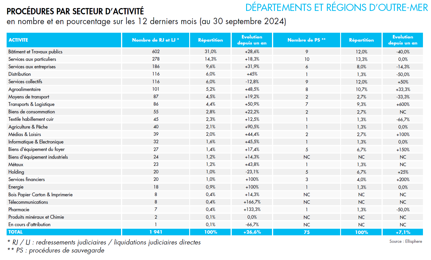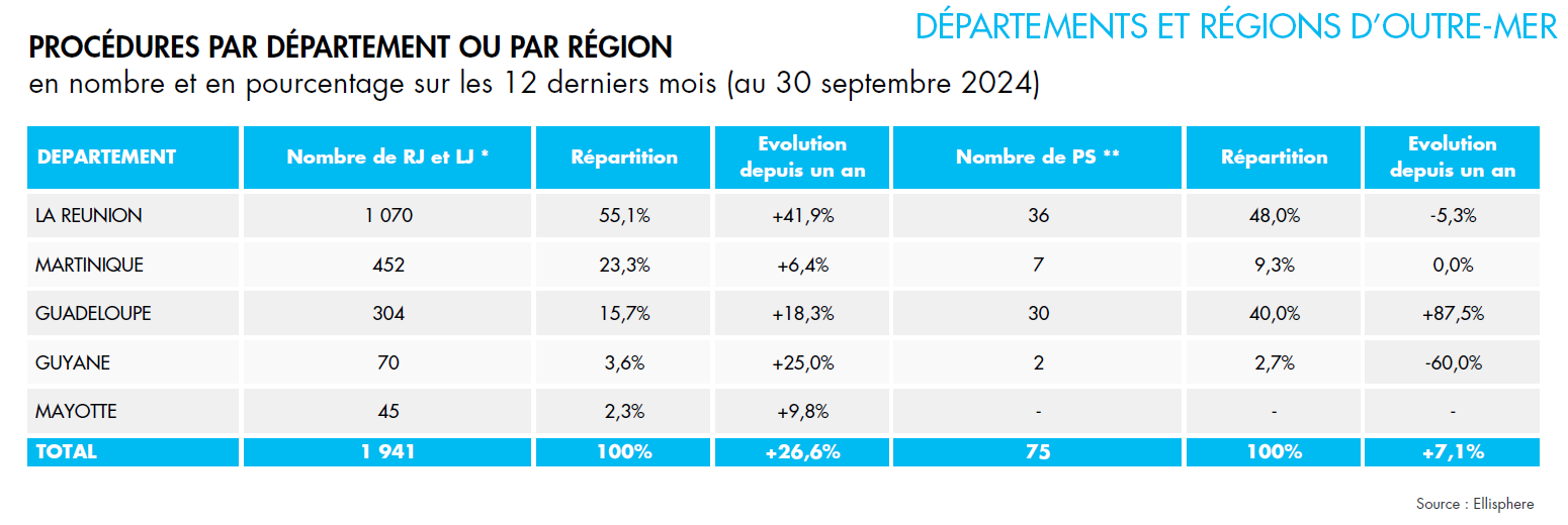 La Guadeloupe, la Guyane et Mayotte enregistrent respectivement 15,7 %, 3,6 % et 2,3 % des défaillances, avec des progressions notables de 18,3 %, 25 % et 9,8 %.