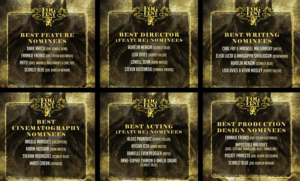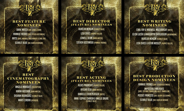 La reconnaissance internationale de SCARLET BLUE a atteint un sommet avec 6 nominations au FOGFEST, le prestigieux festival de films d'horreur de Terre-Neuve-et-Labrador, au Canada dont :