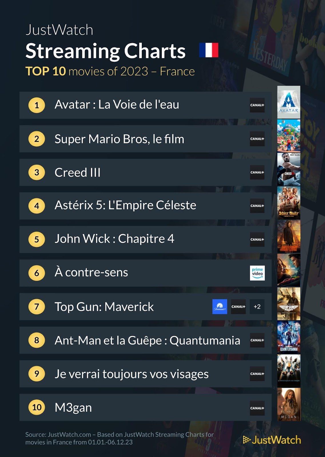 Le service de streaming local Canal+ a dominé le Top 10 des films de l'année avec 9 titres sur 10 disponibles sur la plateforme avec entre autres "Avatar : la voie de l'eau" à la première place suivi de "Super Mario Bros, le film" et "Creed 3" sur la dernière marche du podium, Prime Video et Paramount+ ont tous deux un titre dans la liste, "À contre-sens" (6e) pour le premier cité et "Top Gun Maverick" (7e) pour le second nommé, tandis que les films sur Netflix ne sont pas du tout représentés dans les classements.