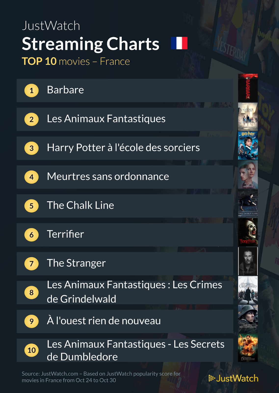 Le site partenaire JustWatch a répertorié les contenus les plus regardés en France sur les différentes plateformes de streaming (Netflix, myCANAL, Prime Video...) du 17 au 23 octobre.