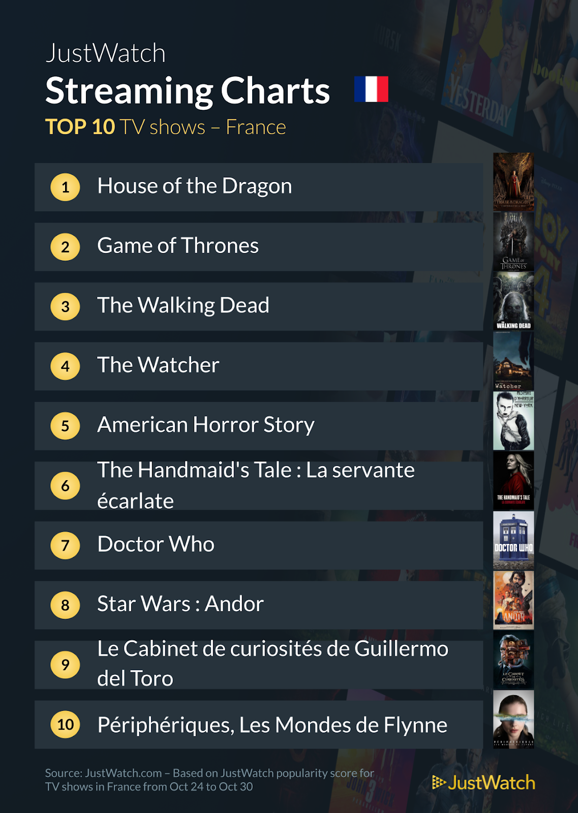 Au niveau des séries, on retrouve ainsi à la première place "House Of The Dragon", la série évènement diffusée sur OCS suivi de "Game Of Thrones" accessible aussi sur OCS et enfin à la troisième place on retrouve "The Walking Dead", disponible sur la plateforme du groupe Orange.