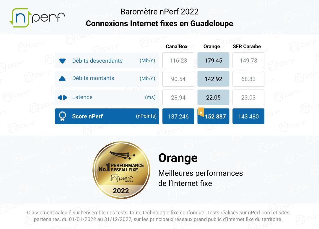 Grâce à une embellie notable (+10 000 points approx., la plus forte des trois opérateurs), Orange parvient à creuser l’écart avec SFR Caraïbe, et se situe aux portes des 150 000 points. Il réalise un sans-faute en menant sur les débits et la latence. Ses progressions sont particulièrement remarquables sur les débits, mais c’est aussi le seul à améliorer sa latence moyenne de 2021.