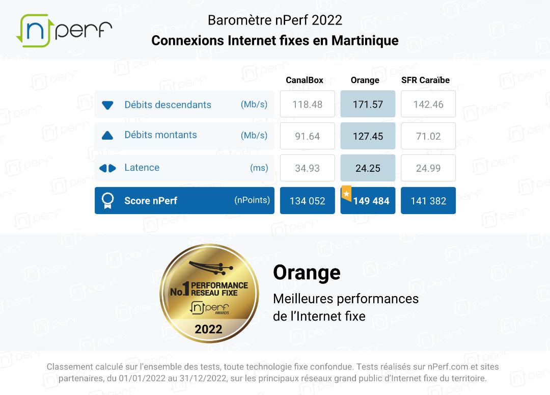 En Martinique, Orange creuse l’écart face à ses rivaux. En effet, il s’octroie une victoire en solitaire sur le débit de téléchargement, regagne la vitesse ascendante face à CanalBox, et ravit la meilleure latence à SFR Caraïbe, tout cela en améliorant ses différentes statistiques. En THD il partage la victoire avec CanalBox, alors qu’en HD c’est avec SFR Caraïbe qu’il l’emporte.