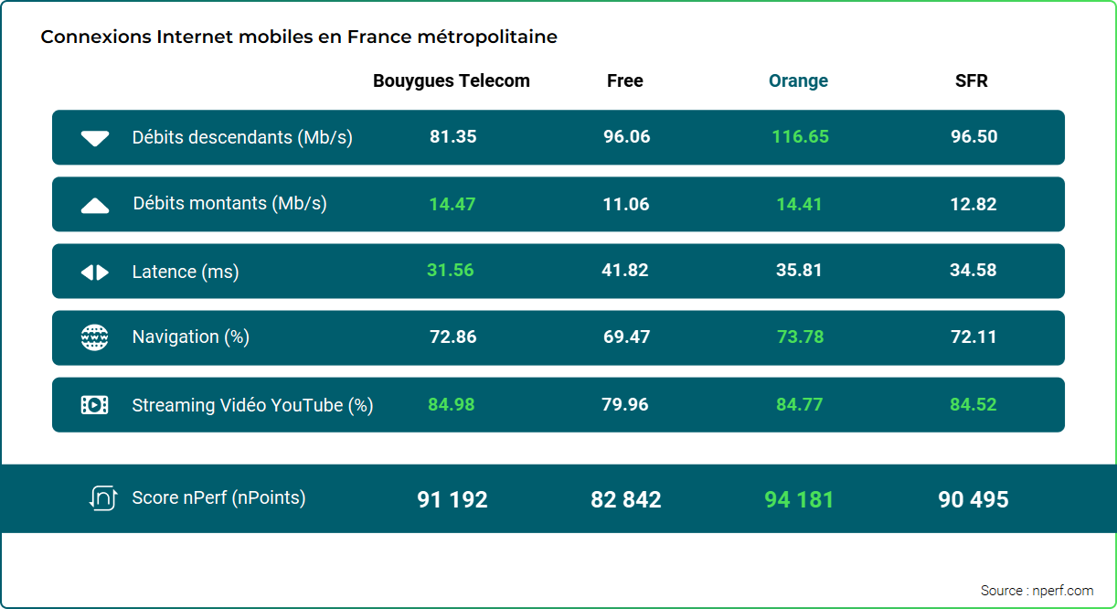 Alors que le trafic de l’internet mobile ne cesse de croitre les résultats nPerf 2023 montrent que les réseaux des opérateurs ne se contentent pas de tenir bon, ils parviennent à s’améliorer. Les internautes français profitent d'une amélioration constante de l'Internet mobile, notamment chez les leaders Orange, Bouygues Telecom et SFR.