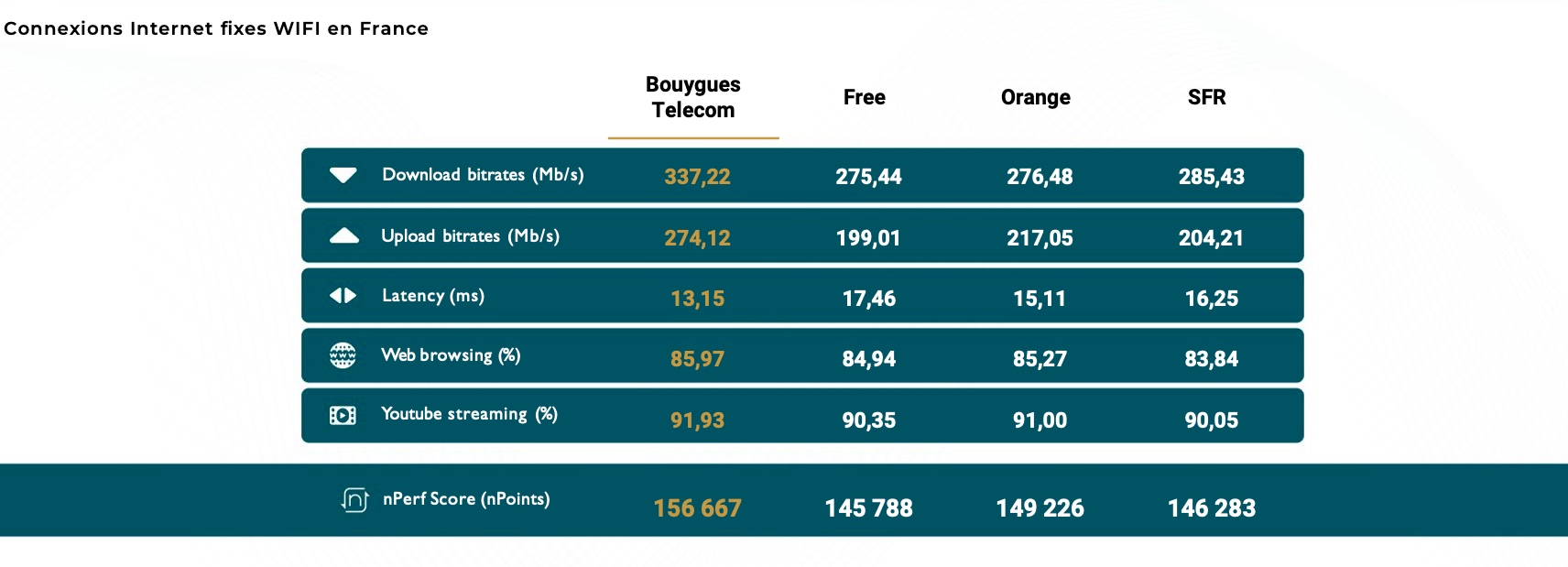 Pour la période analysée, Bouygues Telecom se distingue par un score global impressionnant. L'opérateur reste le leader débits montants, en latence, navigation et streaming vidéo. Bouygues Telecom continue également de dominer en WiFi, renforçant sa position de leader sur le marché de l’internet fixe.