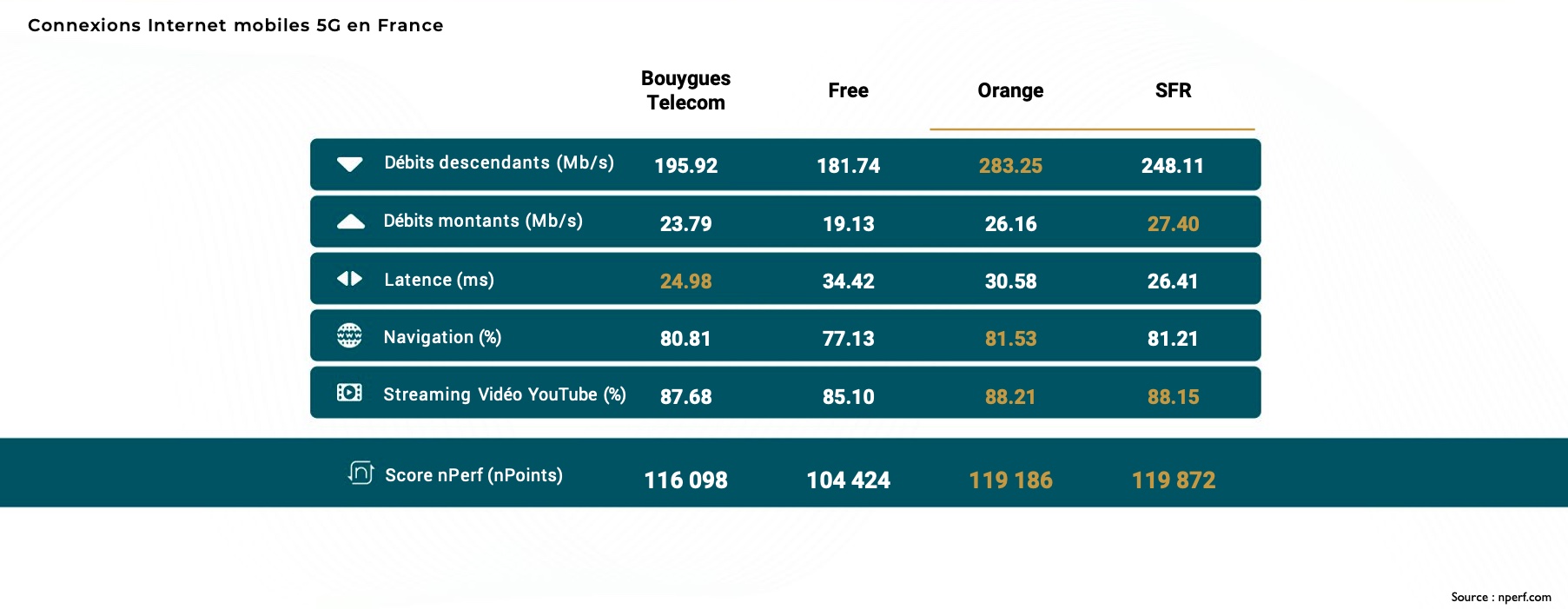 Orange maintient sa position de co-leader 5G et conserve sa dominance en débit descendant. L'opérateur démontre une expertise particulière dans l'optimisation de l'expérience utilisateur, notamment en matière de navigation.