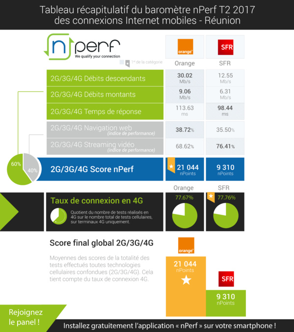 - 6 231 tests de connexions mobiles répartis comme suit après filtrage: 4 854 tests de débits, 1 032 tests de navigation, 943 tests de streaming à la Réunion.