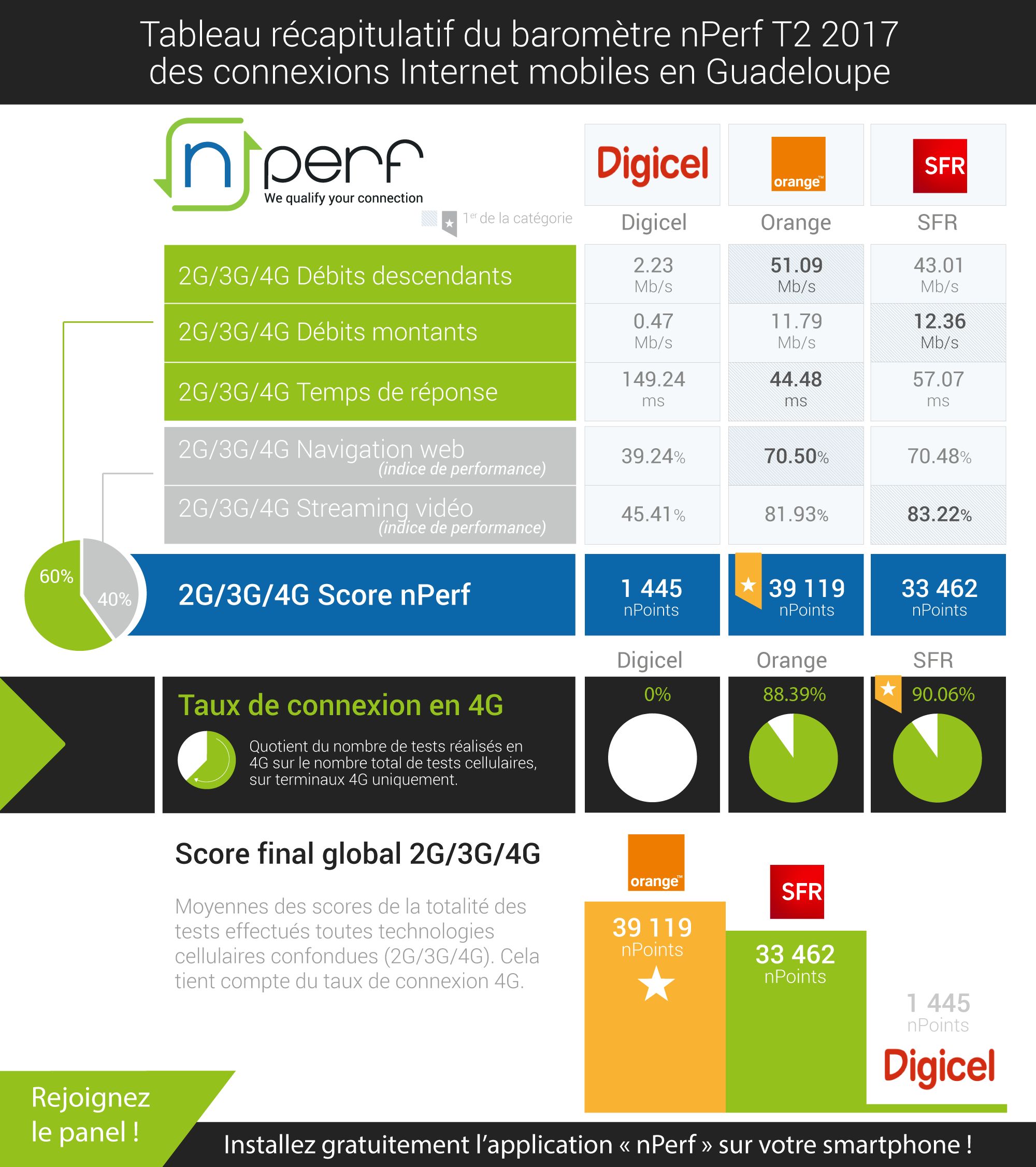 Avec un score global de 39 119 points le réseau d’Orange a délivré la meilleure performance mobile au deuxième trimestre 2017. SFR est deuxième avec un score de 33 462 points. Digicel est très loin derrière avec un score de 1 445 points.