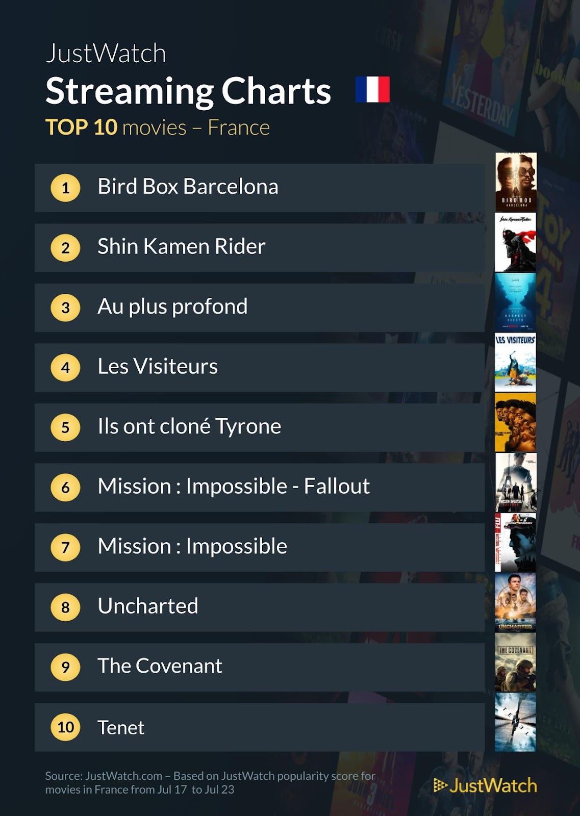 On retrouve ainsi le film "Bird Box Barcelona" avec Mario Casas et disponible sur Netflix à la première place suivi de "Shin Kamen Rider" accessible sur Prime Video et sur la dernière marche du podium on retrouve "Au plus profond" trouvable sur Netflix.
