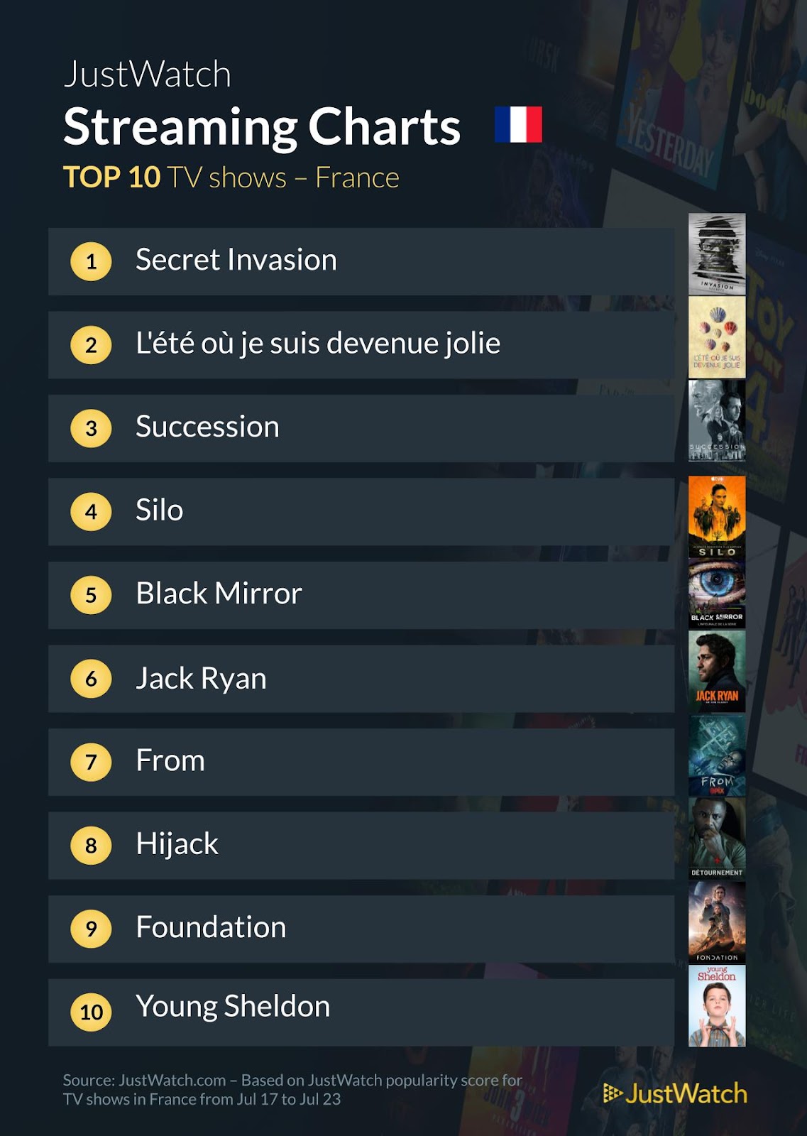 Au niveau des séries, on retrouve ainsi à la première place "Secret Invasion", la série évènement de Disney+ suivi de "L'été où je suis devenue jolie" accessible sur Prime Video et enfin à la troisième place on retrouve "Succession", la série phénomène de HBO, disponible dans le Pass Warner (Prime Video Channels).