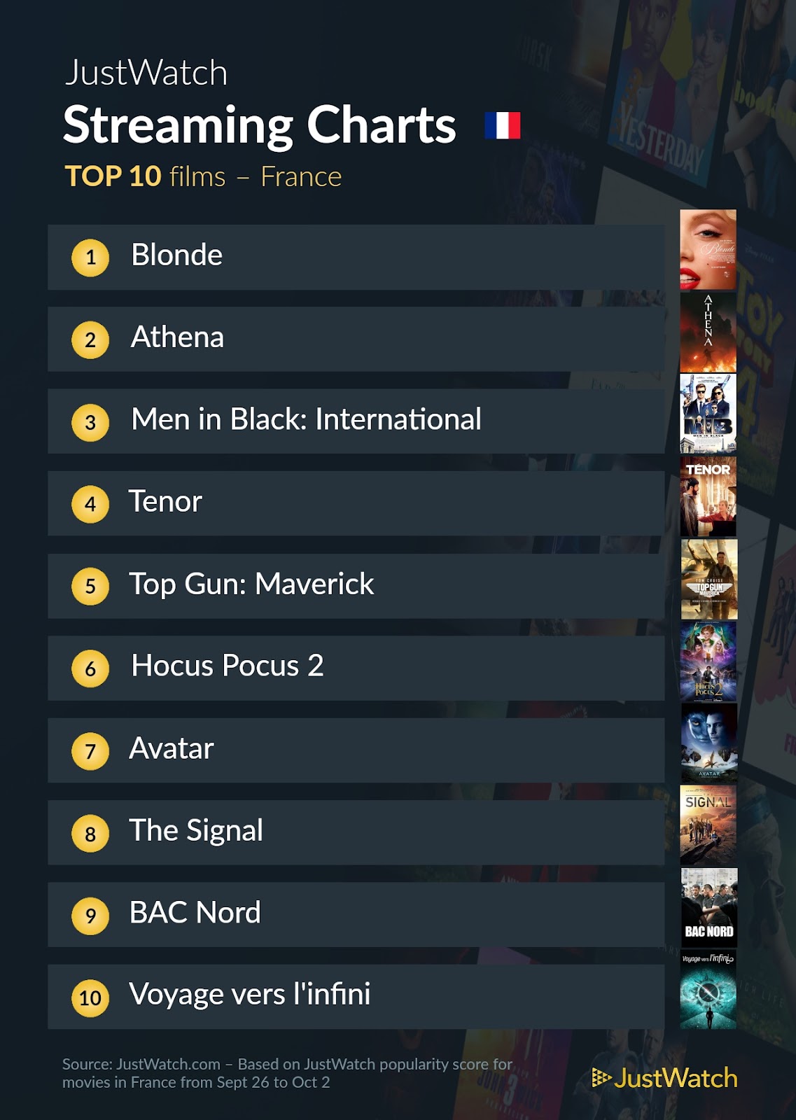 On retrouve un trio de film disponible sur Netflix dont "Blonde" avec Ana de Armas suivi du film "Athena" et enfin sur la dernière marche du podium on retrouve "Men In Black International".
