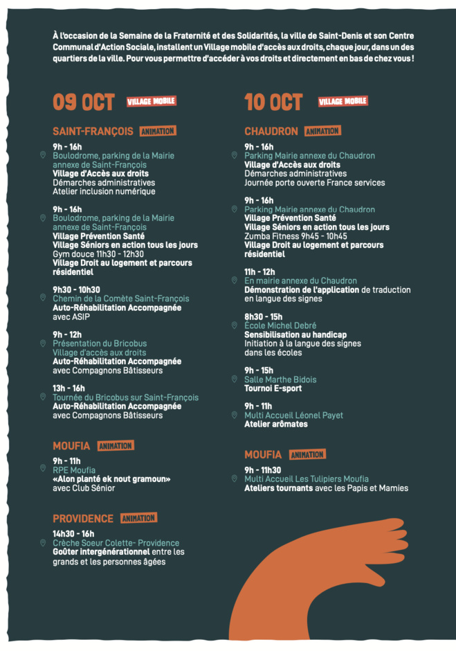 À l’occasion de la troisième édition de la Semaine de la Fraternité et des Solidarités, la ville de Saint-Denis et son Centre Communal d’Action Sociale, seront dans plusieurs quartiers de la capitale pour aller au plus près des citoyens. Au programme : un village d’accès aux droits et de multiples actions fraternelles et solidaires pour permettre notamment à tous les citoyens d’avoir accès à l’ensemble des institutions qui proposent un accompagnement ou des aides. Pendant une semaine, du 9 au 13 octobre, les rencontres vont être intenses et divertissantes afin que chacun puisse faire valoir ses droits et réclamer les aides prévues !