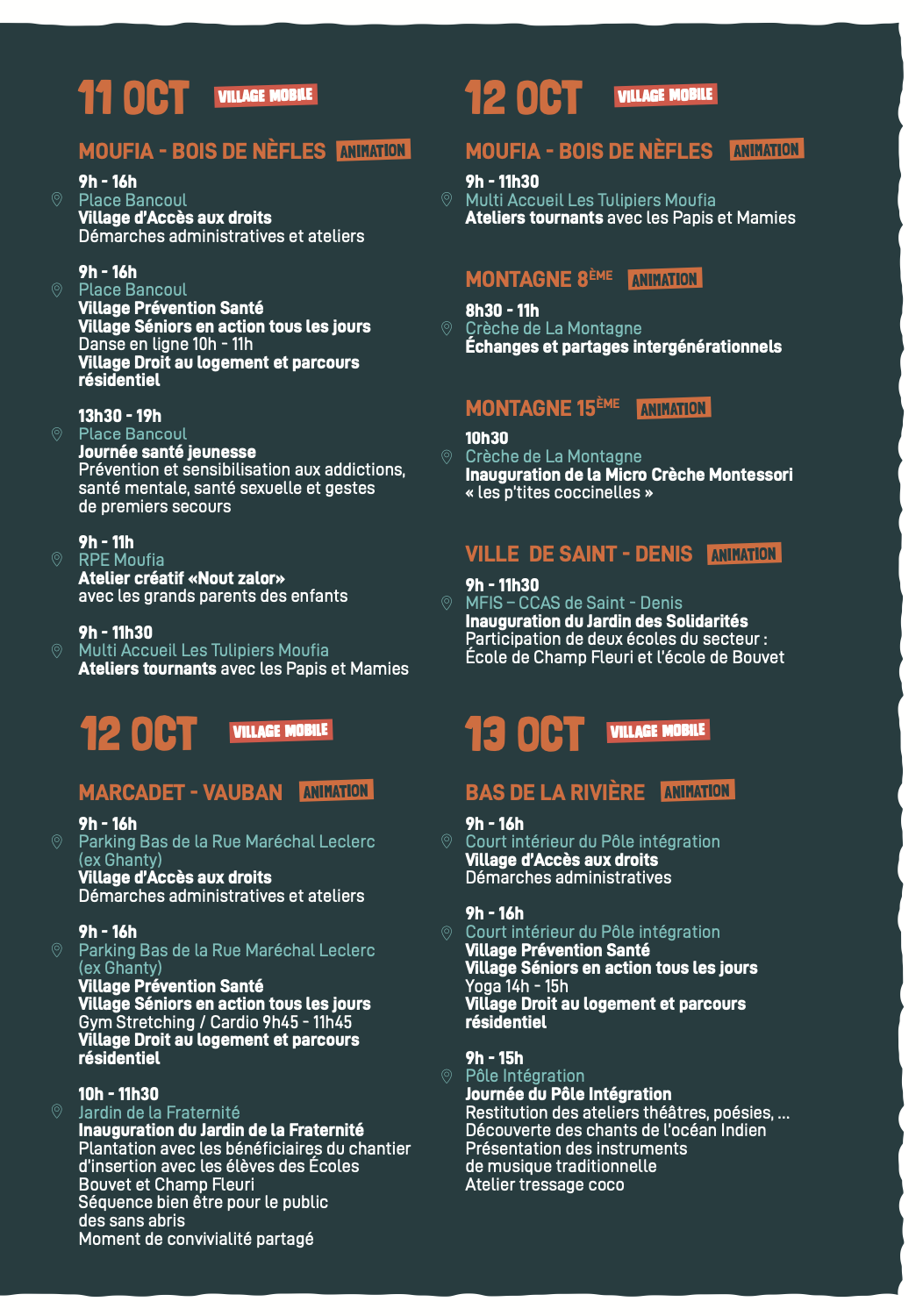 La Semaine de la Fraternité et des Solidarités organisée du 9 au 13 octobre, permet de mettre en œuvre, pour la troisième année consécutive, des actions avec tous les services sociaux fléchés afin d’aller Droit au BUS (Le bus d’accès aux droits du CCAS de la Ville de Saint-Denis) pour y trouver l’accompagnement et l’aide nécessaire avec les partenaires présents tels que Le Département de La Réunion, La CGSS, La CAF, L’ADRIE et Solidarnum.