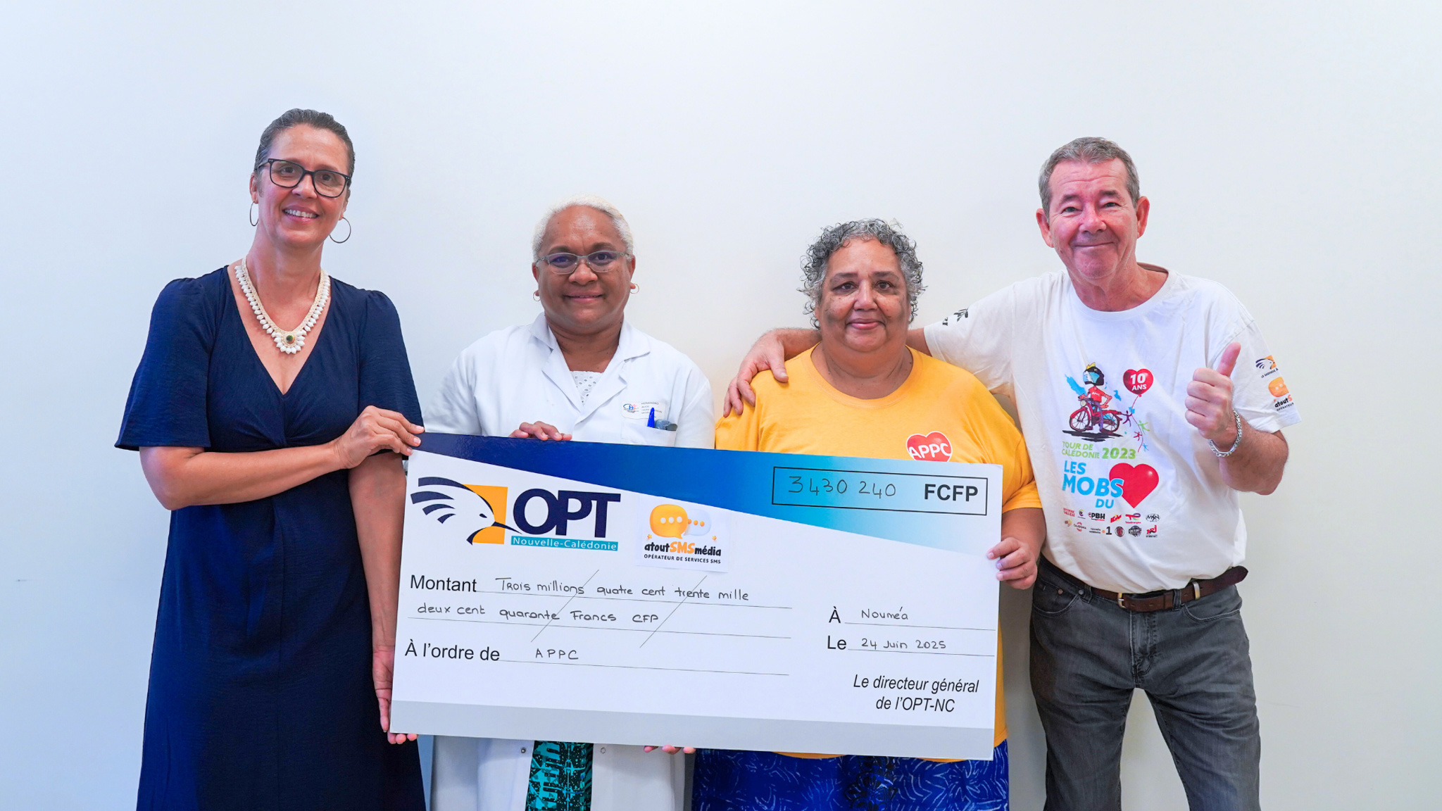 C’est un chèque symbolique et chargé d’émotion qui a été remis ce mardi 24 juin 2025 à l’Association des Petits Pansements du Cœur (APPC). L’OPT-NC et Atout SMS Média ont officiellement clôturé la 12ᵉ édition de la Campagne du Rêve en reversant la totalité des fonds collectés : 3 430 240 FCFP issus de 15 592 SMS de dons envoyés entre le 17 mars et le 21 mai dernier.