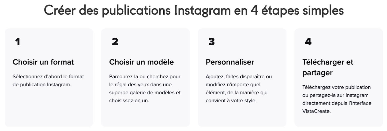 Pour faire un post Instagram plusieurs étapes peuvent être mises en place. Il est possible de débuter avec la sélection de modèles proposés par le site VistaCreate. Ces modèles sont très utiles pour débuter une publication quand on manque d’inspiration, de ressources (telles que des images, des vidéos ou des animations) et aussi de temps.