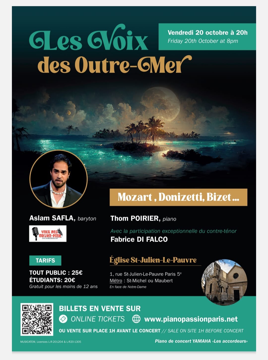 En concert Voix des Outre-mer la voix superbe du baryton réunionnais Aslam Safla et quelques surprises pour une soirée exceptionnelle dans l'intimité de l'église Saint-Julien le pauvre, ce lieu magique face à Notre Dame .