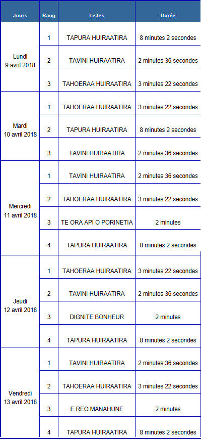 TAHOERAA HUIRAATIRA : 33 minutes 42 secondes, soit dix émissions de 3 minutes 22 secondes ;