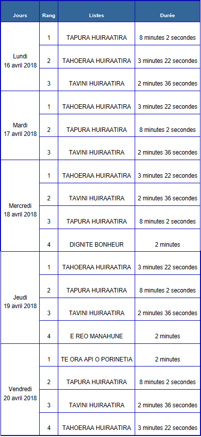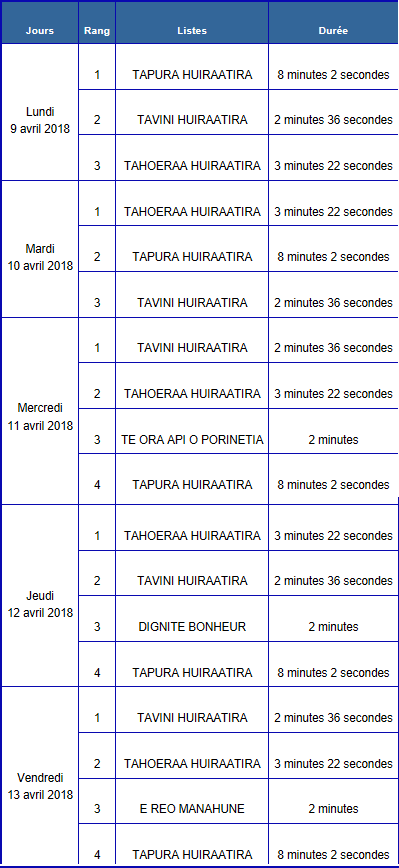 Le Conseil supérieur de l'audiovisuel (CSA), après en avoir délibéré, décide que la durée d'émission attribuée pour la campagne électorale en vue du premier tour de l'élection des membres de l'assemblée de la Polynésie française, le 22 avril 2018, est de 2 heures et 20 minutes pour les listes présentées par des partis et groupements politiques représentés à l'assemblée de la Polynésie française. Une durée de 4 minutes est attribuée à chacune des autres listes.