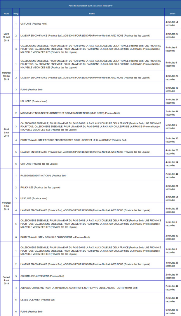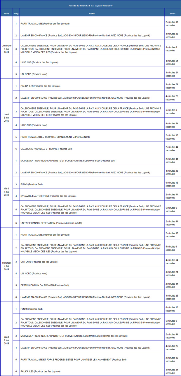 Les dates et l'ordre de passage des émissions de la campagne audiovisuelle officielle en vue de l'élection des membres du congrès et des assemblées de province de la Nouvelle-Calédonie du 12 mai 2019