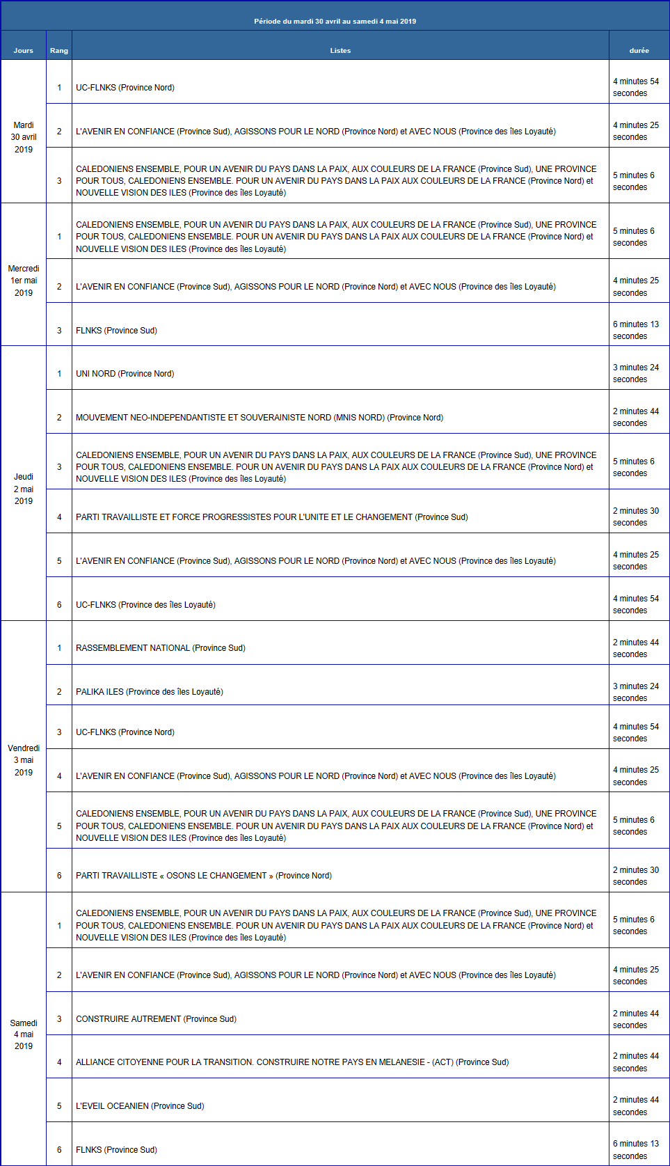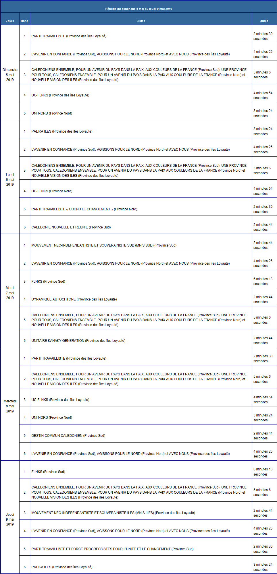 - PARTI TRAVAILLISTE (Province des îles Loyauté) : 5 minutes, soit 2 émissions de 2 minutes 30 secondes ;