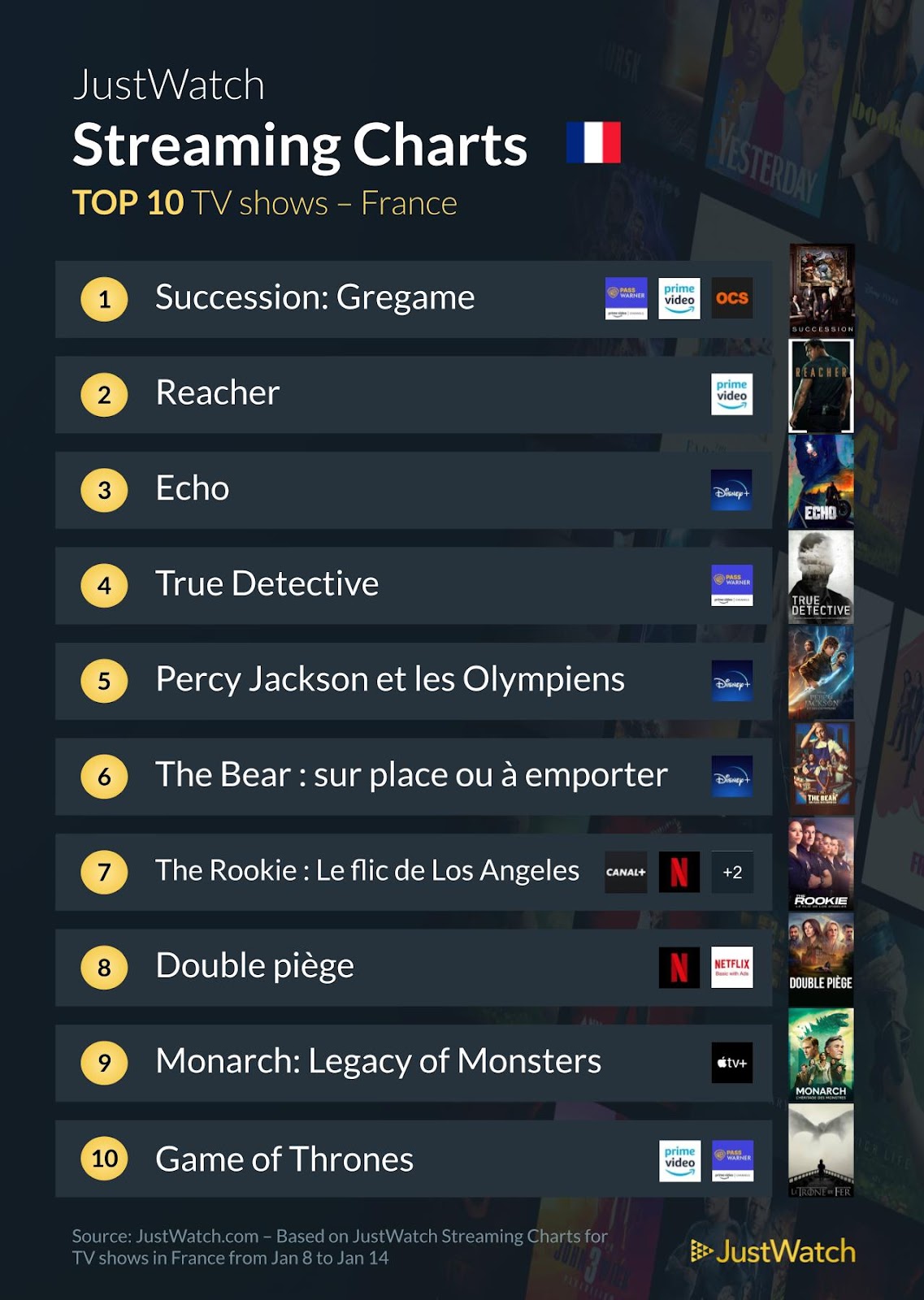 Le site partenaire JustWatch a répertorié les contenus les plus regardés en France sur les différentes plateformes de streaming (Netflix, myCANAL, Prime Video...) du 8 au 14 janvier 2024.