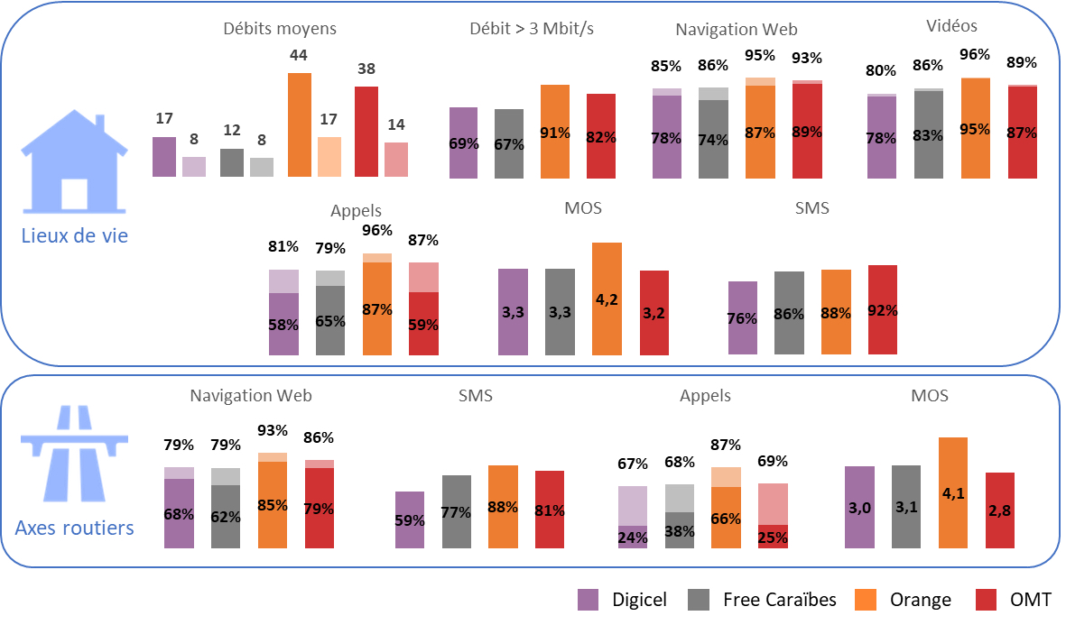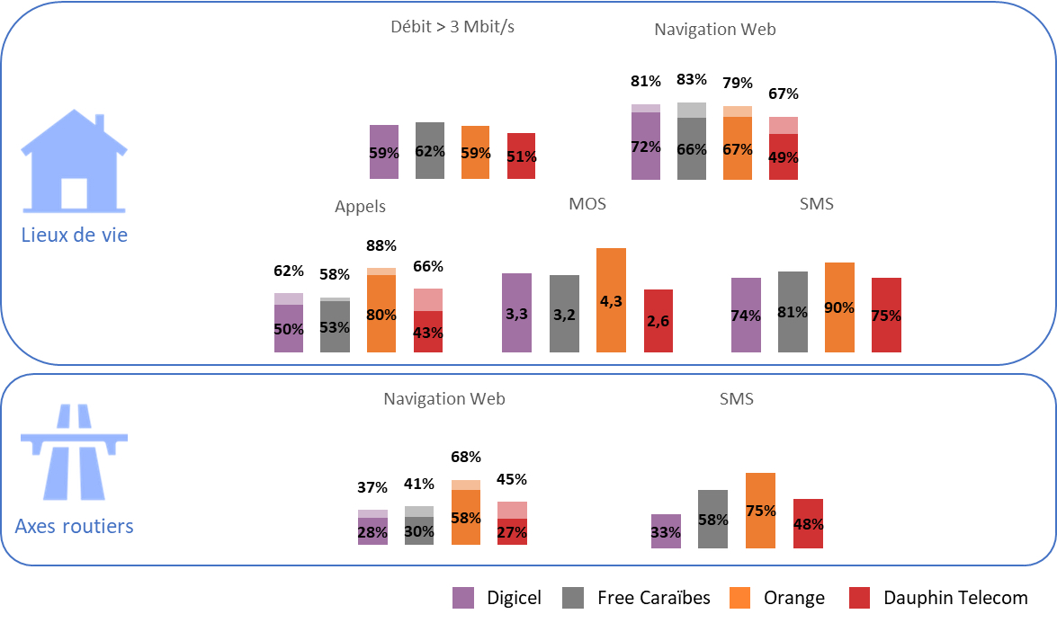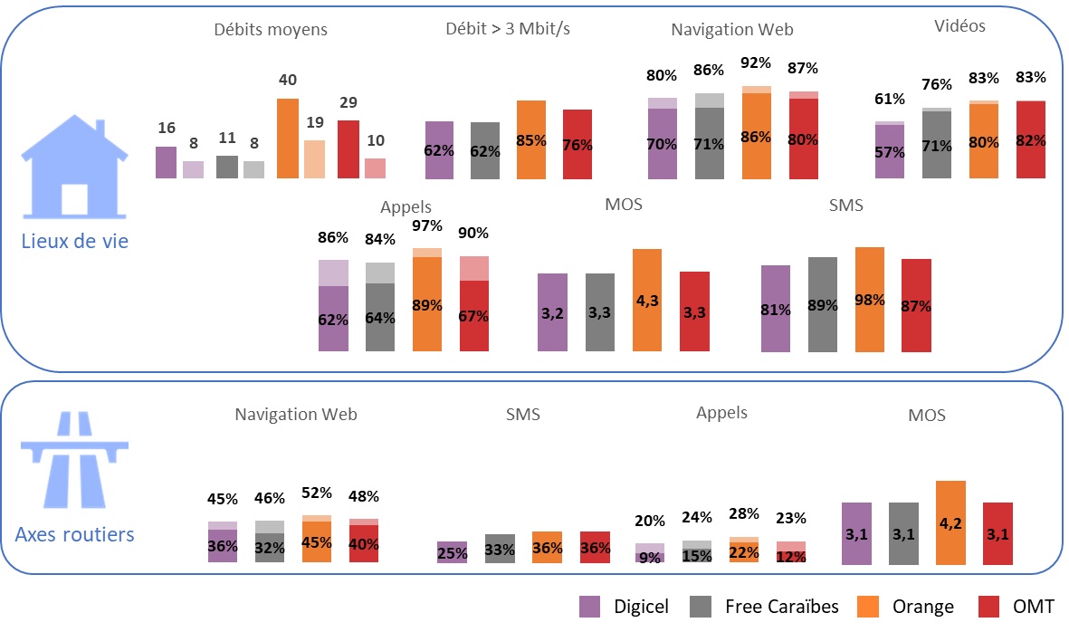 - À Saint-Barthélemy et Saint-Martin, pour l’ensemble des opérateurs, les performances tant en matière de Voix que d’usages d’internet demeurent faibles par rapport au reste du territoire national. Orange présente globalement les meilleures performances sur les indicateurs Voix et SMS.