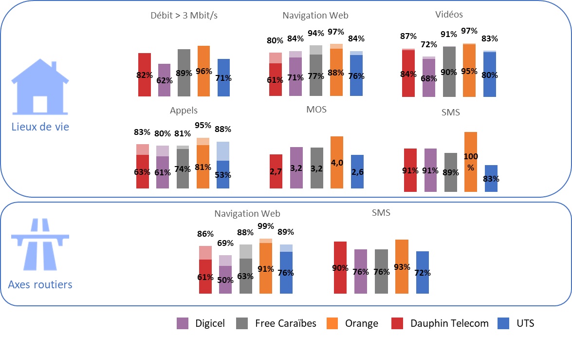 - À Saint-Martin, Free Caraïbe présente de bonnes performances sur les usages d’internet et se classe deuxième. Dauphin Telecom se place troisième derrière Free Caraïbe pour les vidéos visionnées en qualité parfaite. UTS se classe deuxième pour les indicateurs de communications réussies dans les lieux de vie et la navigation web sur les axes routiers..