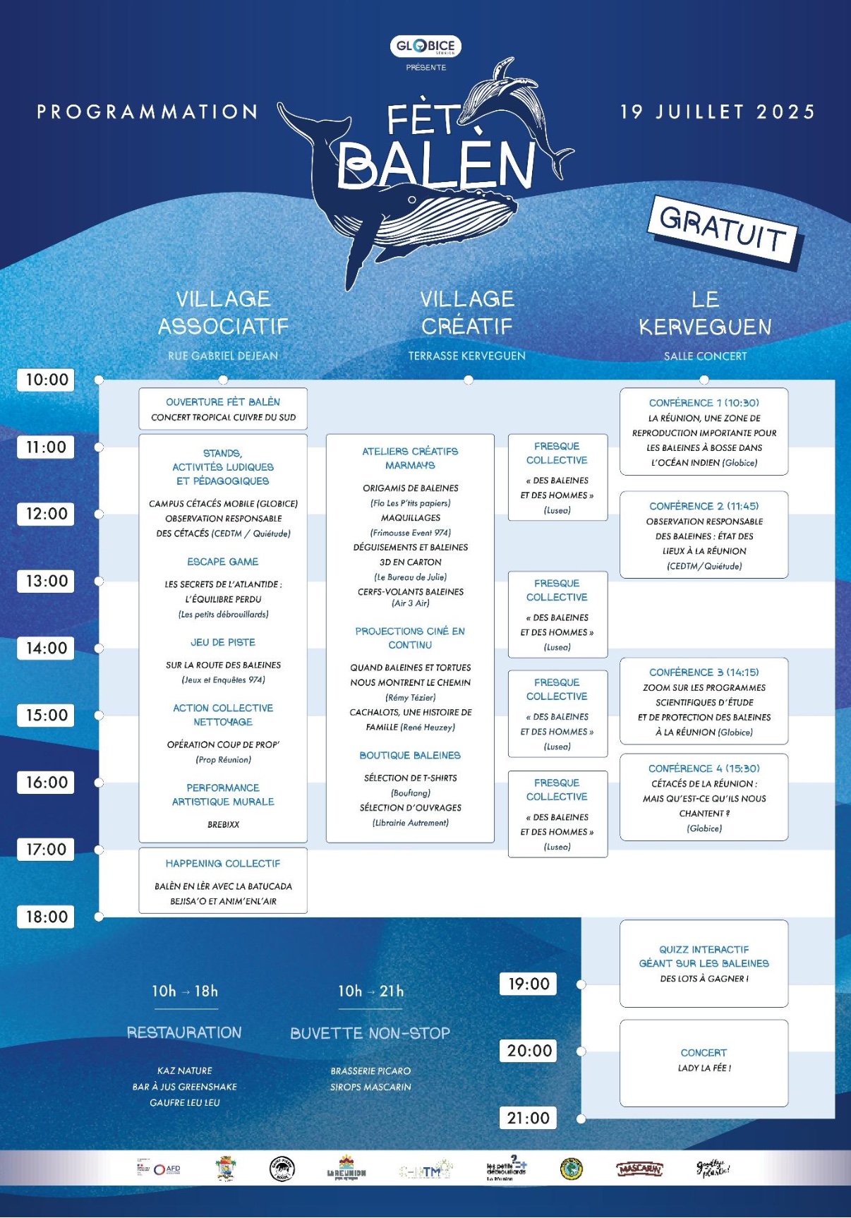 Pensée comme un véritable pont entre science, culture et société, la Fèt Balèn rassemble naturalistes, artistes, scolaires, associations et familles autour d’un objectif commun : faire des cétacés un symbole fort d’engagement écologique à La Réunion.