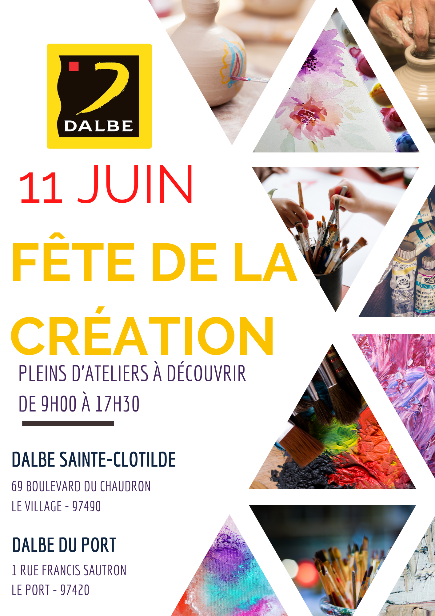 Rendez-vous le samedi 11 juin 2022 de 9h00 à 17h30 dans vos magasins Dalbe du Port et de SAINTE CLOTILDE, pour les ateliers de la fête de la création.