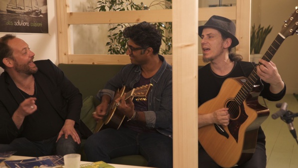 Mais Sébastien Folin n’est pas seulement calé dans tous les genres musicaux, du maloya au jazz en passant par la pop ou les musiques électroniques, il aime ça, vraiment ! Au point d’échanger quelques notes à la guitare avec les musiciens croisés au fil de la soirée.