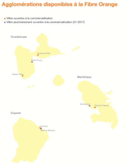 Le programme d'Orange relatif à la construction du réseau en fibre optique jusqu'à l'intérieur des habitations et locaux professionnels s'étalera de 2015 à 2022 et concerne les communes de: Basse-Terre, Pointe-à-Pitre, Petit-Bourg, Fort-de-France, Schoelcher, Cayenne et Rémire-Montjoly.