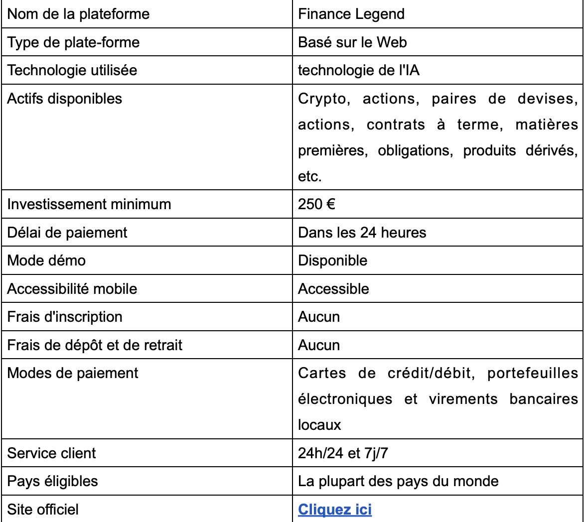 Finance Legend est une plateforme de trading de cryptomonnaies créée par une équipe d'experts pour simplifier chaque étape du trading et aider même les traders débutants à réaliser des profits significatifs. Le système combine des technologies avancées, telles que l'intelligence artificielle et des algorithmes sophistiqués, pour réaliser des analyses de marché en temps réel, collecter des données précieuses, notamment des tendances et des modèles, et fournir des signaux et des informations précis, permettant aux utilisateurs de prendre des décisions éclairées. Cette analyse Finance Legend examine en détail la plateforme afin d'en évaluer l'authenticité.
