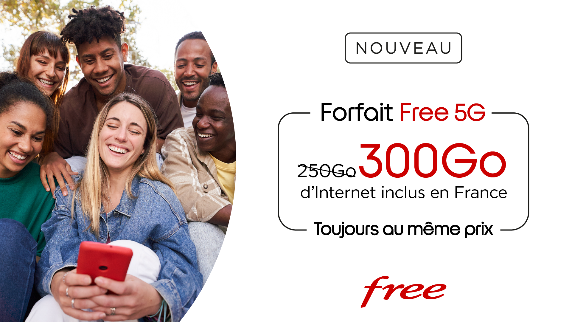 Free booste l’enveloppe d’Internet utilisable en France métropolitaine pour ses abonnés au Forfait Free 5G à 300 Go/mois en 5G/4G contre 250 Go jusqu’à présent et toujours au même prix (19,99€/mois).