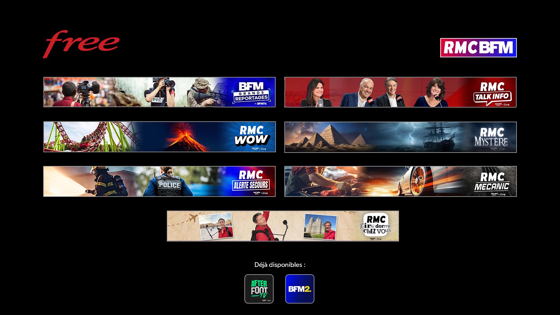 Free annonce l’arrivée de 7 nouvelles chaînes du groupe RMC BFM dans son offre de télévision Freebox : BFM Grands Reportages, RMC Talk Info, RMC WOW, RMC Mystère, RMC Alerte Secours, RMC Mecanic, RMC J'irai dormir chez vous.