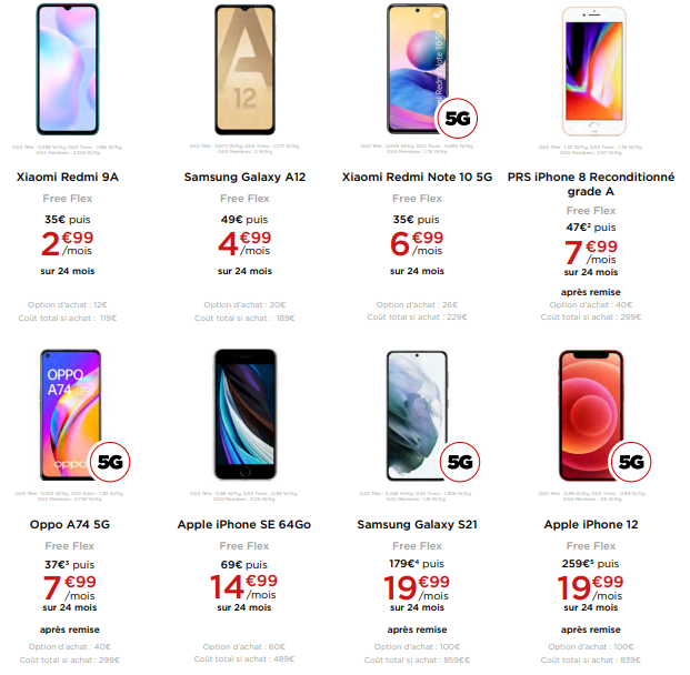 Avec Free Flex, Free rend accessible les téléphones du marché en permettant d’étaler le paiement de son mobile sans aucun frais, grâce à la location avec option d’achat. En cas d’activation de l’option d’achat, le prix total payé avec Free Flex est le même qu’en le payant en une fois au comptant. Les derniers smartphones des plus grandes marques (Apple, Samsung, Xiaomi, Oppo...) sont proposés, mais aussi les téléphones les plus accessibles et les terminaux reconditionnés.