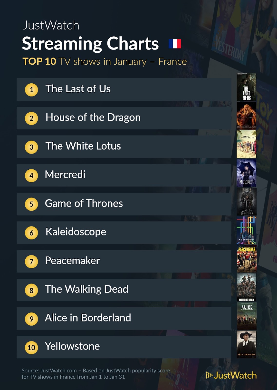 Au niveau des séries, on retrouve à la première place "The Last of Us", la série phénomène d'HBO disponible sur Prime Video, suivi de "House Of The Dragon" disponible sur OCS et enfin à la troisième place on retrouve ainsi "The White Lotus" accessible sur OCS.